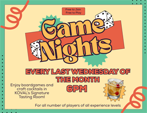 Enjoy your favorite board and card games with a craft cocktail at KOVAL! Bring your games, bring your friends, or find your favorite new game and friends to be at our beautiful, cozy tasting room. Whether you want to hop in for a quick game or lock in for a competitive session, there’s a game for you!